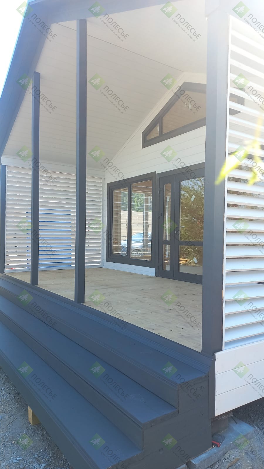Каркасно-щитовые. Фронтоны - евровагонка С. Торцы - профнастил оцинковка. Утепление-50мм.